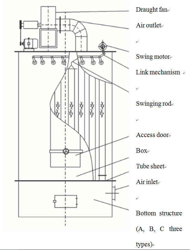 The basic structure of this series of filters consists of three parts, i.e. draught fan, box and ash hopper: